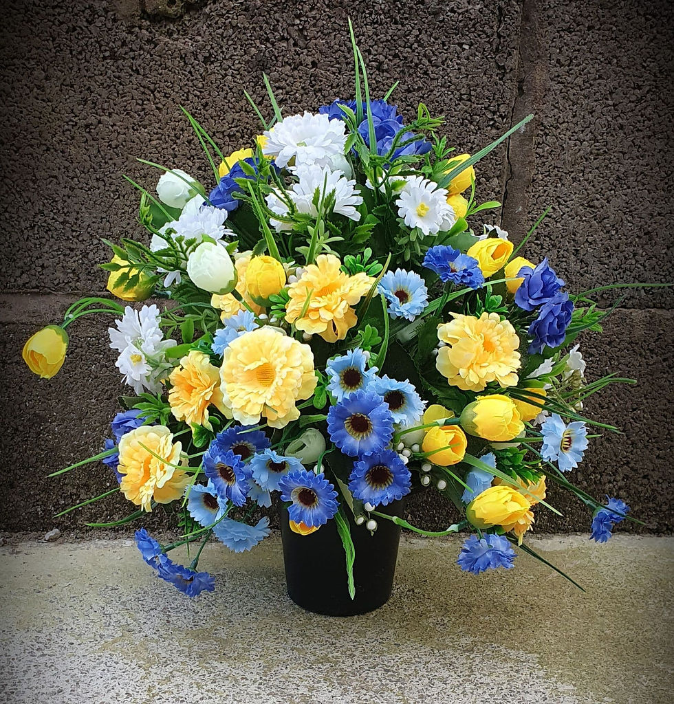 GRAVE POTS / INSERT - - YELLOW WHITE & Blue Mix Display
